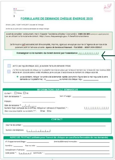 - disponible en ligne sur le site du chèque énergie, onglet « Documents disponibles » au lien suivant : https://chequeenergie.gouv.fr/beneficiaire (document pdf imprimable et saisissable en ligne) ;