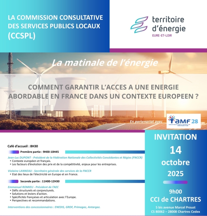 Le mardi 14 octobre 2025, Territoire d’Énergie Eure-et-Loir organise, à la Chambre de Commerce et d'Industrie d'Eure-et-Loir et en partenariat avec l'Association des Maires d'Eure-et-Loir, la matinale de l’énergie sur le thème suivant :